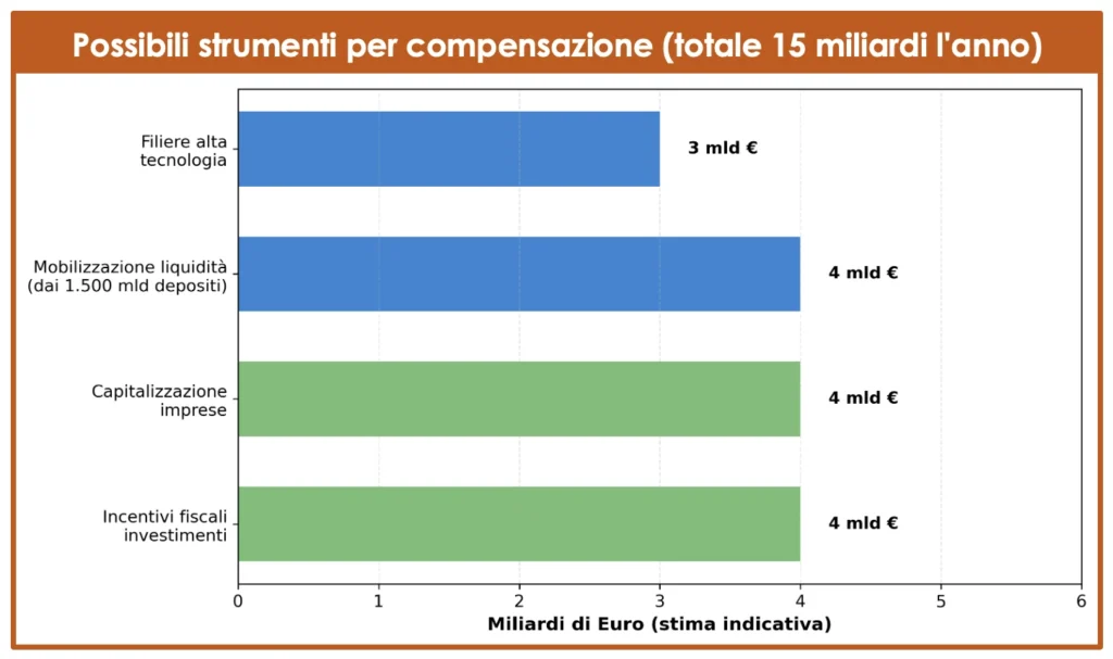 La differenza è sostanziale: non si tratta di sostituire 40 miliardi di cantieri e trasferimenti, bensì di costruire un pacchetto di misure in grado di generare un effetto crescita analogo con un impiego di risorse più contenuto e meglio selezionato. Quei 15 miliardi annui rappresentano una soglia significativa ma non fuori scala per la finanza pubblica italiana, pari a poco meno dello 0,7% del Pil. È un ordine di grandezza compatibile con una strategia pluriennale che punti su incentivi fiscali agli investimenti privati, sostegno alla capitalizzazione delle imprese, strumenti per mobilitare una parte dei circa 1.500 miliardi di euro di liquidità oggi detenuti in depositi bancari e postali, e interventi mirati sulle filiere ad alta intensità tecnologica.