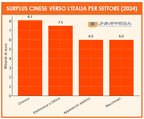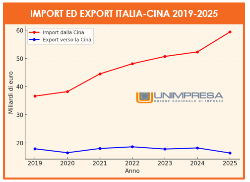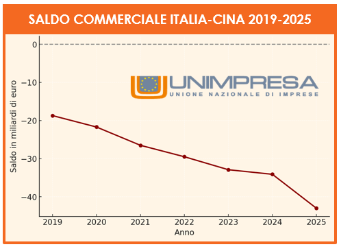 In sei anni il disavanzo commerciale tra Italia e Cina è più che raddoppiato, passando da –18,7 miliardi di euro nel 2019 a –43 miliardi nel 2025, con una crescita del 62% delle importazioni italiane dai mercati cinesi. Nel 2024 la Cina ha esportato in Italia beni per oltre 52 miliardi di euro, a fronte di 18 miliardi di export italiani verso Pechino. Nei primi sette mesi del 2025 le importazioni dalla Cina sono aumentate del 29,3%, mentre le esportazioni italiane sono diminuite del 10%, con un peggioramento del saldo di oltre 9 miliardi. Il surplus cinese verso l’Italia è concentrato in quattro comparti principali: chimico (8,1 miliardi), elettronico e ottico (7,5 miliardi), apparecchi elettrici (6 miliardi) e macchinari (6 miliardi). La dipendenza italiana dalle forniture cinesi è più elevata nei settori del mobilio (26,9%), tessile (24,1%) e apparecchi elettrici (21,7%).